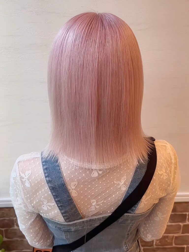 今回のスタイルは、ブリーチでしっかり明るさを整えた後、ダメージを最小限に抑えるケアブリーチを使用し、淡く透けるようなピンクを表現しました。