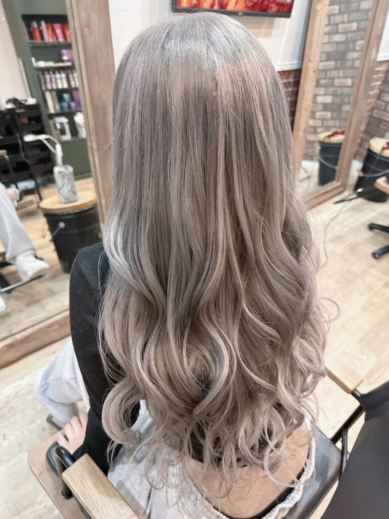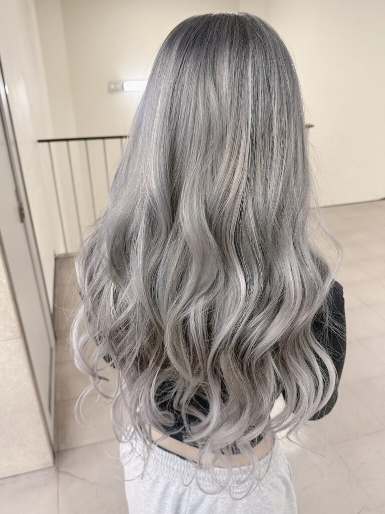 ブリーチを2回行い、透明感のあるシルバーカラーに仕上げました。