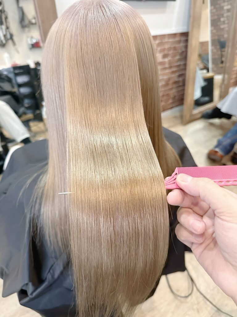 ダメージを最小限に抑えるケアブリーチを使用し、ミルクティーやグレージュ、ホワイト系などの人気カラーも再現。髪質や履歴に合わせて薬剤を調整することで、仕上がりのクオリティと色落ちの綺麗さにもこだわっています。
