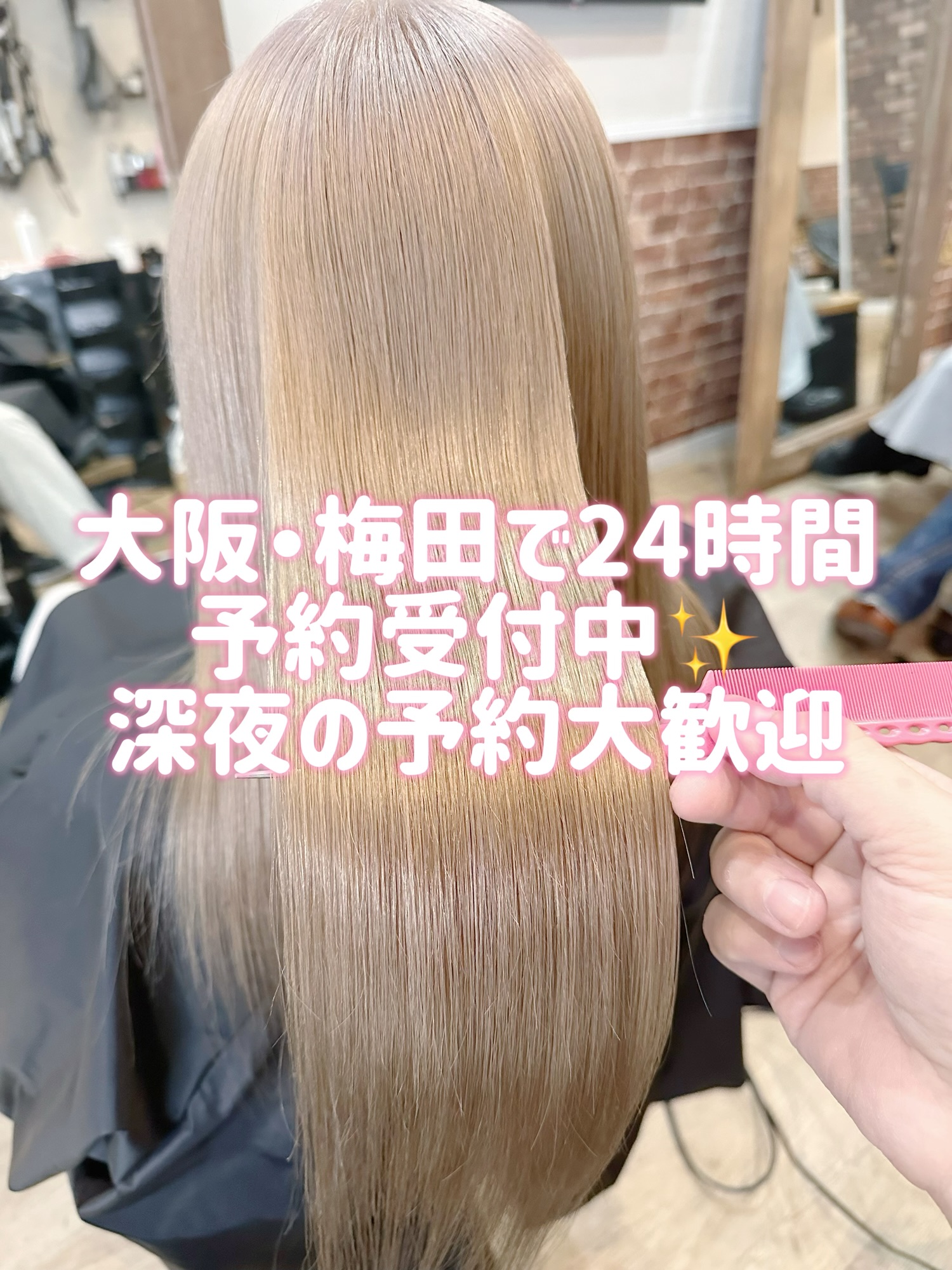 また、大阪梅田エリアでは珍しい「深夜営業対応」の美容院として、仕事終わりや夜遅くの時間帯でもご予約いただけます。