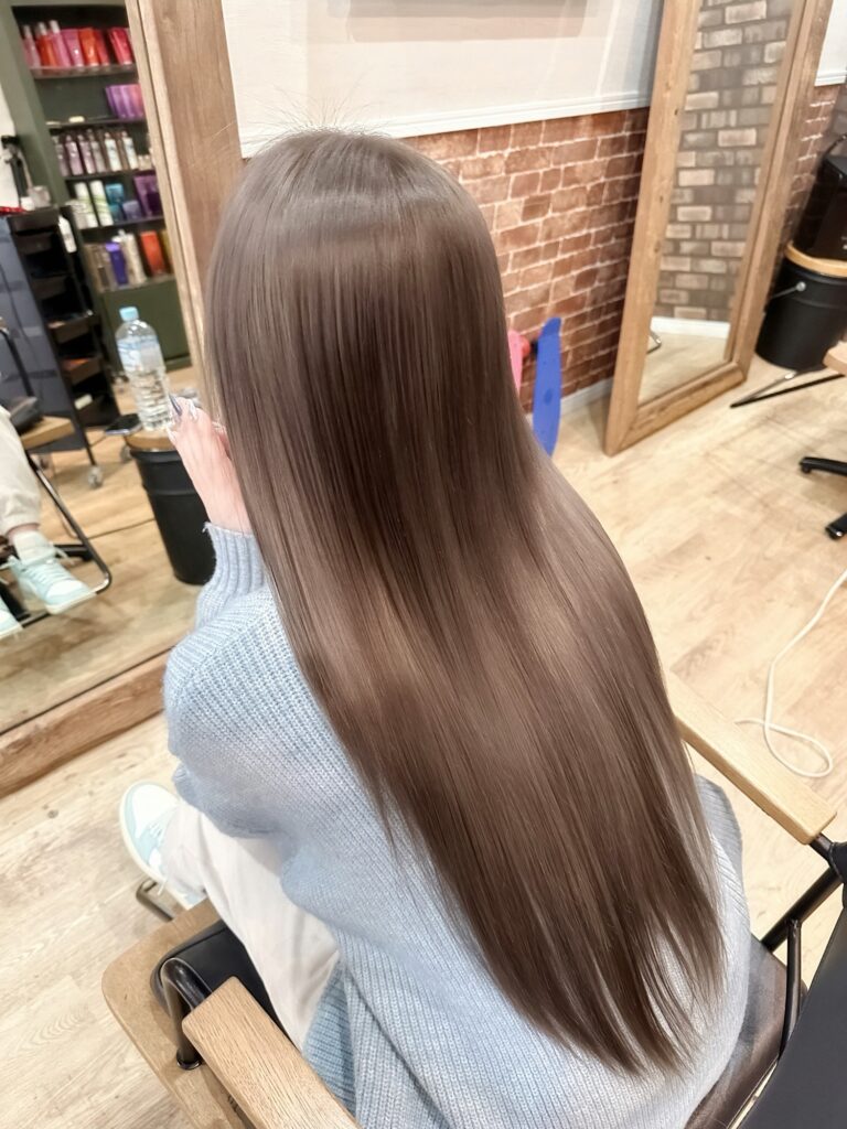 今回のスタイルは透明感抜群のシルバーグレージュカラー。赤みをしっかり抑えた柔らかい色味で、暗めでも重たく見えず、光に当たると綺麗に透けるのが特徴です。